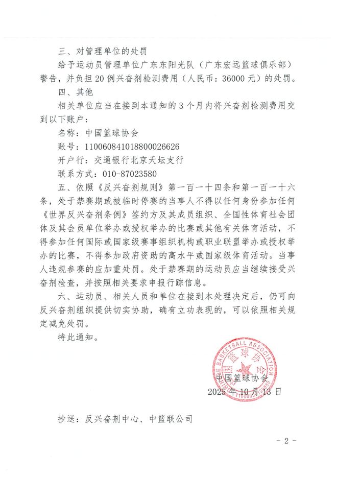 中国篮球协会根据国家体育总局《反兴奋剂规则》的有关规定,给予吉伦沃特禁赛3个月的处罚,禁赛期自2025年10月13日至2026年1月12日;对运动员管理单位广东东阳光队(广东宏远篮球俱乐部)警告,并负担20例兴奋剂检测费用(人民币:36000元)的处罚。