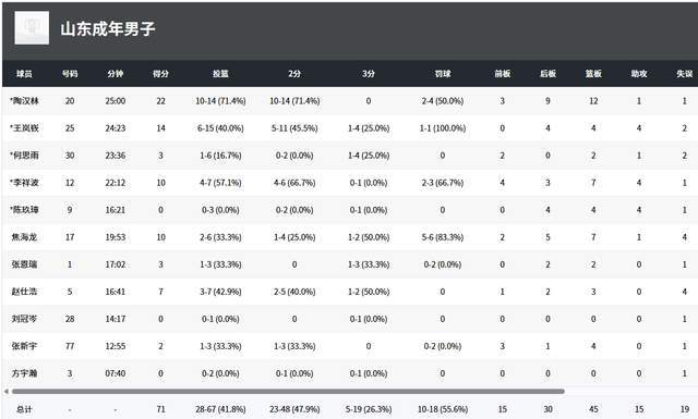 山东队已经打得很好了,全队4人得分上双,陶汉林爆发,14投10中,独砍22分12篮板,王岚钦15投6中,拿到14分4篮板4助攻,李祥波7投4中,拿到10分7篮板4助攻,焦海龙6投2中,拿到10分7篮板。