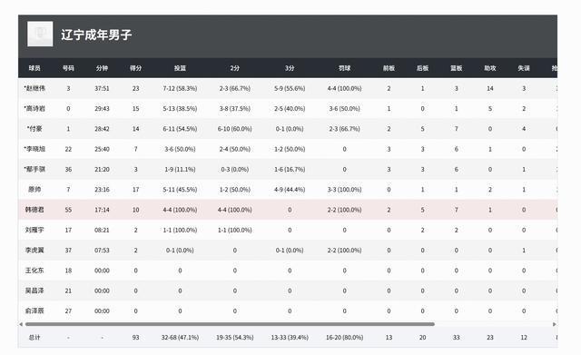 辽宁男篮赵继伟23分3板14助3断,原帅17分1板2助1断,高诗岩15分1板5助1断。
