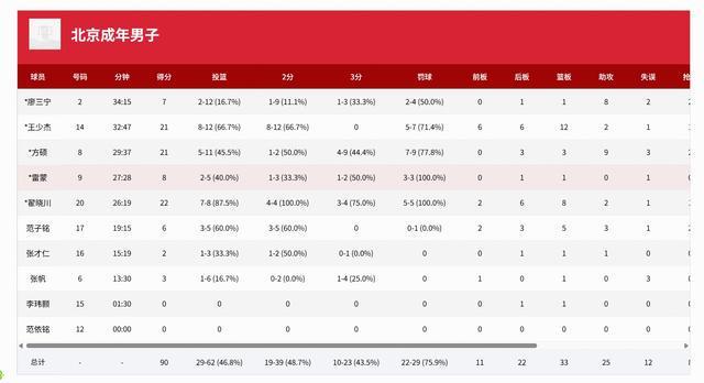 北京男篮:翟晓川8投7中,三分4中3拿到22分8板2助1断,王少杰21分11板2助1断1帽,方硕21分3板9助2断,廖三宁12投仅2中拿到7分1板8助;