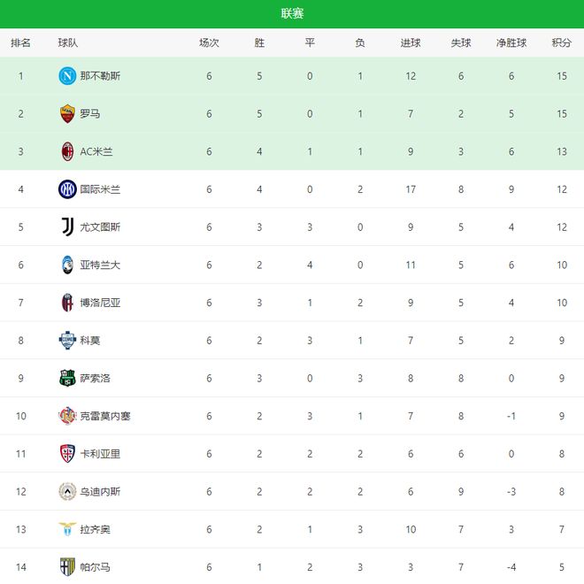 第1名:那不勒斯,5胜1负,积15分;