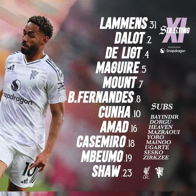 曼联首发:31-拉门斯、23-卢克-肖、4-德利赫特、5-马奎尔、2-达洛特、18-卡塞米罗、8-布鲁诺-费尔南德斯、16-阿马德-迪亚洛、10-马特乌斯-库尼亚、19-姆伯莫、7-芒特